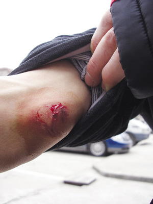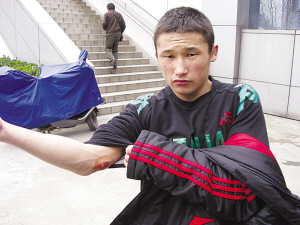赛后,记者找到了被咬的甘肃选手叶尔兰别克·卡泰,在队友的陪伴下,他正在队医处给伤口上药。记者现场可以看到,杯口大的伤口上两排牙印十分明显,虽然已经经过队医的处理,但是伤口还在往外渗血。一旁陪伴他的队友心痛地说:“咬得也太狠了吧,以前我们从来没遇到过这种事情,太恶劣了!”叶尔兰别克·卡泰告诉记者,当时被咬了以后自己疼得立刻泄了气,比赛也没办法继续下去,反而被对手扳倒取胜,自己心里“实在咽不下这口气”。但是考虑到下午还有比赛,加上结果已经无法改变,他也只好接受这个事实。
