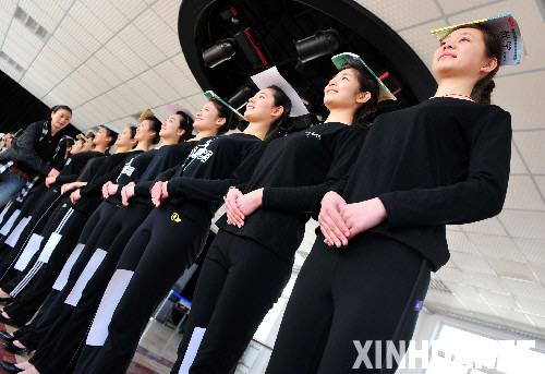 3月25日,曾担任北京奥运会礼仪志愿者培训老师的王迅(左一)在对志愿者进行形体指导。