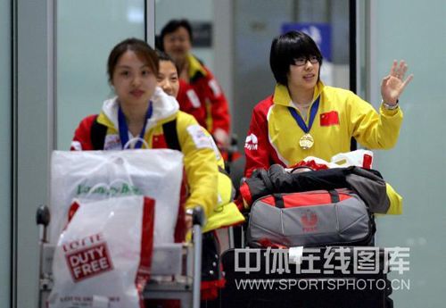 2009年3月30日,首次夺得世锦赛冠军的中国女子冰壶队回到北京。此次世界女子冰壶锦标赛决赛在韩国江陵结束,中国队在决赛中以8比6战胜都灵冬奥会冠军瑞典队,历史性地获得冰壶世界冠军。(中体在线图片 魏征 摄)