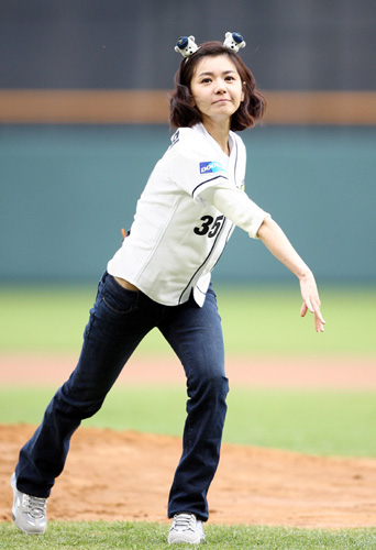 韩星亮相赛场笑容可爱 玉臂掷球大秀蛮腰(组图)(2)