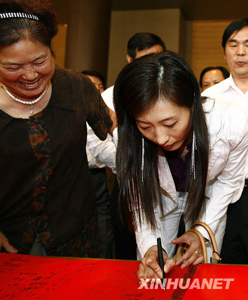5月2日,奥运冠军张宁(前右)在嘉宾簿上签到。当日,羽毛球奥运冠军高崚的婚礼在北京举行,众多明星前来祝贺。新华社记者张晨摄