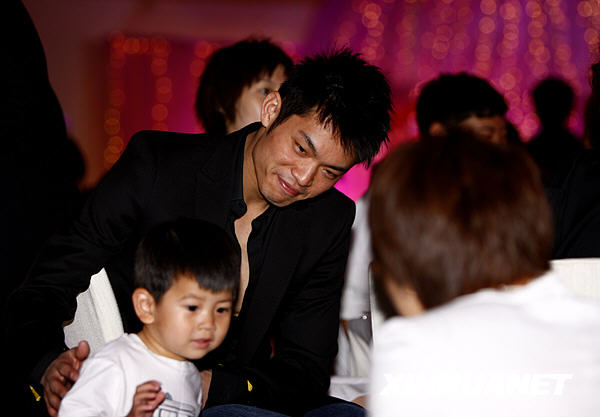 5月2日,林丹在高崚的婚礼上与一位儿童玩耍。当日,羽毛球奥运冠军高崚的婚礼在北京举行,众多明星前来祝贺。新华社记者张晨摄
