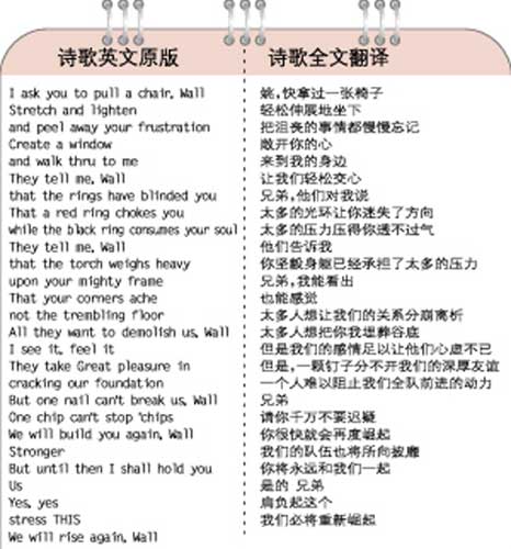 尽管这首诗是不是麦蒂亲笔所写,目前还没有得到最终的确认。但诗中的这种浓浓的兄弟之情,正是火箭队全队目前所需要的。在没有姚明的情况下,火箭队只有团结一心,努力奋斗,才能向着球队的目标一步步迈进。