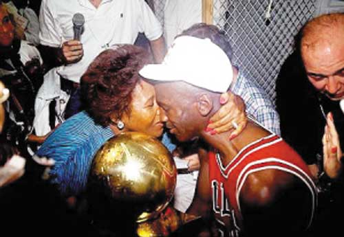 金光闪闪的总冠军奖杯前,乔丹与母亲相拥。