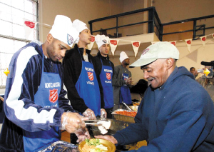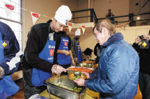 昨天,易建联(左图左一)和卡特、哈里斯等篮网队员一起来到新泽西的一家教堂,在感恩节到来之际,向当地社区贫困居民分发食品。在活动现场,易建联身着便装头戴一顶绣有篮网标志的厨师帽发放食物,整个活动过程中易建联始终面带微笑,并和获赠食物的居民亲切交谈。