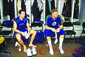 反正在赛前,你绝对见不到更衣室里人员扎堆的情况。赛场上练完投篮的人,还会跑到更衣室练点别的;在更衣室里按摩的人,弄完之后也会跑到赛场上再练会。而且,大家练习的时间也不一样。有的人练得早,有的人出来得晚,在这样的情况下,你要看到球员聊天说话,实在不是一件容易的事情。一般也就一两个球员碰到一起,换衣服的时候、吃东西的时候,才会相互聊上两句。要想在赛前采访球员,除了等待,还得看运气。