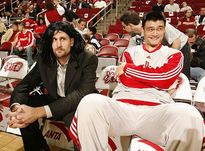 “斯科拉”一身黑西装坐在姚明的身旁,旁边的姚明捧腹大笑,嘴中还念念有词。不,出了个小差错,姚明身边的人不是斯科拉,而是布伦特·巴里,他正戴着火箭为主场球迷们准备的斯科拉超酷假发头套。赛前,前2000名来到丰田中心的球迷都会获得斯科拉的假发头套,坐在第一排的球迷和工作人员均戴上了假发套。这次斯科拉的假发头套不仅让球迷得到愉悦,就连姚明也笑得直不起腰来。