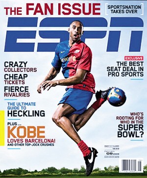 科比日前再次公开表达了自己对西甲豪门巴塞罗那的喜爱,在新一期ESPN杂志的封面上,科比身穿巴萨的红蓝球衣,摆出踢足球的姿势。