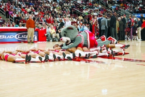 中国德比的主角自然应该是姚明和易建联。可是火箭的吉祥物火箭熊非常“不爽”,偏要抢抢两个东方大个子的风头,招数就是:耍流氓!面对躺在地板上任“熊”宰割的美女们,火箭熊就差没流口水了,一点也不怜香惜玉的把硕大的身体压在美女们身上(上图)。不过昨天可是火箭熊14岁大寿,天大地大寿星公最大,在自己的主场撒撒野也是无可厚非的。