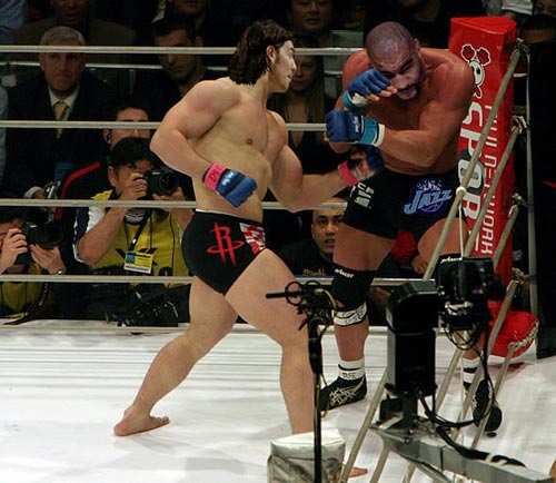 白人拳手斯科拉身着一条印有火箭队徽的黑色拳击短裤,在拳击台上勇猛无比,他正以一记左勾拳刺向布泽尔,而且虽然只是一个侧面,但隐约可见斯科拉神情专注,杀气腾腾,一副志在一拳将其KO倒地的气势。而肌肉比斯科拉更发达的布泽尔,则一副饶命相,他蜷缩在拳台的角落,左手试图挡住斯科拉刺出的重拳,右手则十分猥琐地护住自己的眼睛,似乎只有招架之功,而毫无还手之力。不过这张PS图片也有漏洞,一则是拳击场上运动员穿的应该不是紧身短裤,二是两人的短裤的颜色不应该都是黑色。不过总的来说,这张图片PS得非常成功,布泽尔短裤上的爵士队标清晰可见,而且两人的神态也是惟妙惟肖,直接反应出了斯科拉的强势和布泽尔的不堪一击。