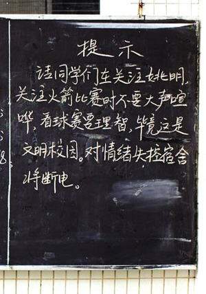 在广州某大学,为限制学生狂热的心情,宿管处黑板上出现了一个奇怪的布告:请同学们在关注姚明、关注火箭比赛时不要大声喧哗,看球赛要理智,毕竟这是文明校园。对情绪失控的宿舍将断电。