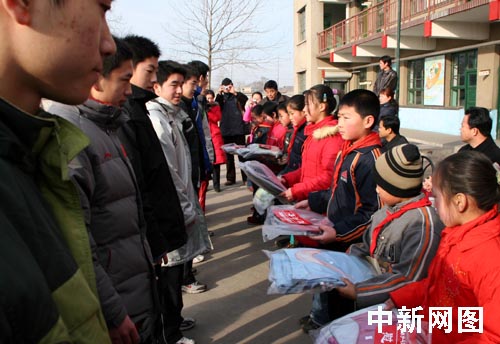 中新网石家庄1月26日电 (记者 牛琳)正在河北正定国家乒乓球训练基地集训的国家乒乓球男二队的队员们,今天上午来到正定县南楼乡南楼中心小学,将总额达数万元的现金以及学习用品、体育器材等捐献给这里的孩子们。
