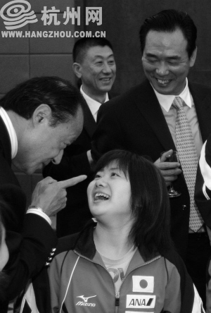 本报讯 因为堵车,赶到杭州天马大酒店时晚点了,“小爱等了你一刻钟”,福原爱的教练郑慧萍透露:小爱随日本队下楼赴欢迎晚宴去了,“别急,我来安排”。