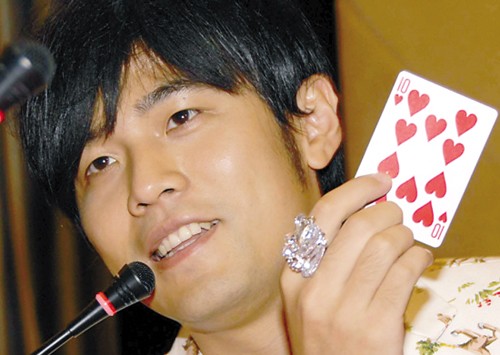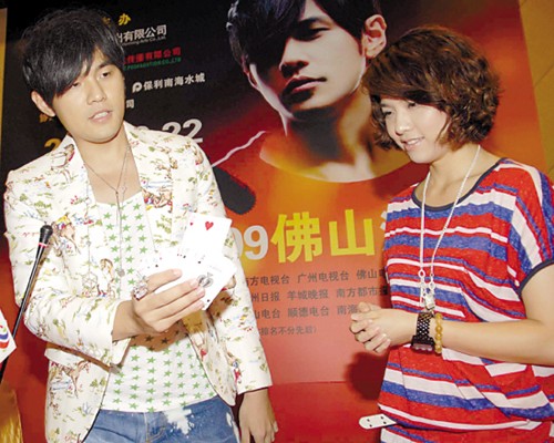 昨日下午,周杰伦以“雪碧”品牌代言人身份,来到广州新长隆酒店举行千人大型歌迷见面会,刚刚拍完电影《刺陵》的周杰伦似乎是在沙漠地带待得太久,不仅主动要求记者提些“奇怪的问题”,而且有问必答,还在现场分别为歌迷与记者连玩了数场扑克魔术。他十分肯定地承认自己玩魔术的确有“喧宾夺主”的嫌疑,但仍自夸“魔术玩得太好,我还想明年准备做一场大型魔术主题演唱会”。