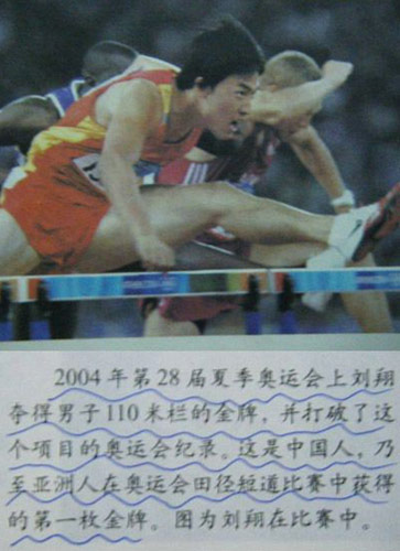 在图片下附着的文字说明这般写道:“2004年第28届夏季奥运会上刘翔夺得男子110栏的金牌,并打破了这个项目的奥运会纪录。这是中国人乃至亚洲人在奥运会田径短道比赛中获得的第一枚金牌。图为刘翔在比赛中。”