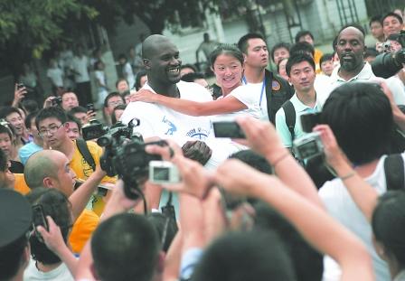 天气很热,孩子们很快有点支持不住,于是坐在人行道上等。下午四时,伴随着前面队伍的欢呼声,奥尼尔乘坐的加长凯迪拉克终于开进了校园。三位黑衣壮汉飞奔而来,守住位置,奥胖庞大的身体好不容易从轿车里钻出来。“噢,好高哦!”尽管无法靠近奥尼尔,但小同学们仍然这样惊叹。