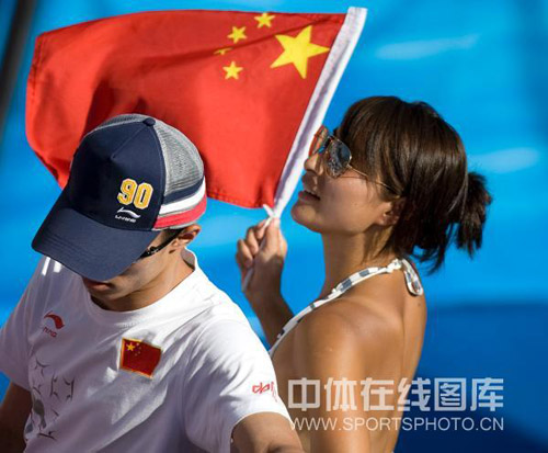 2009年7月23日,第13届世界游泳锦标赛在意大利罗马继续进行。在跳水男子单人3米板决赛中,中国选手何冲勇夺冠军。名将郭晶晶出现在了观众席上,为中国队加油助威。图为郭晶晶现身助阵。