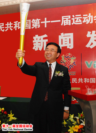 十一运会火炬“如意”4月28日在济南正式亮相。图为十一运组委会副主任、山东省副省长黄胜为十一运会火炬式样揭幕。(曹亮 摄)