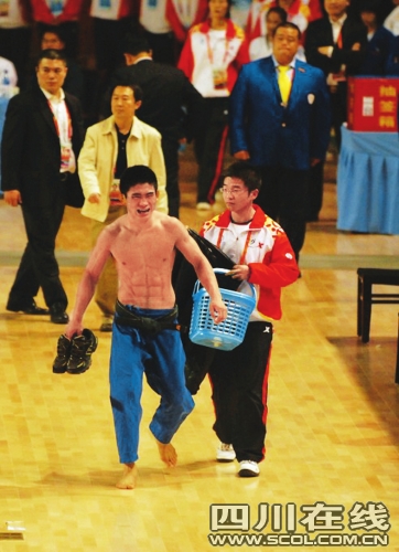 同样,在比赛中受伤的山西队杨波在男子60公斤级比赛中迎战解放军队阿拉木斯时,在比赛后借势坐在场地上拒绝离开,并怒砸场地。而女子48公斤级决赛中,四川队选手龚华也站在场地拒绝离场,在裁判交涉后才离开场地。