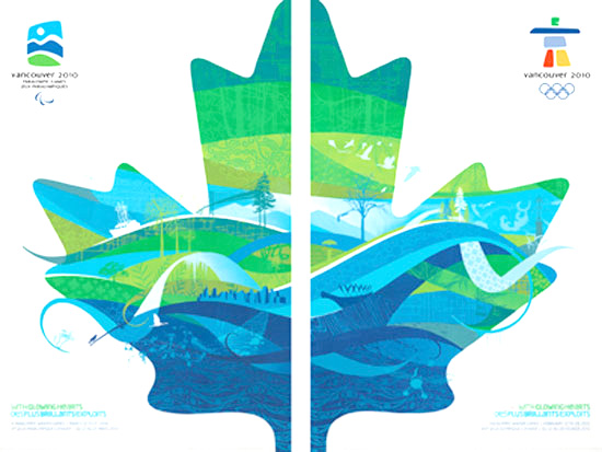 冬奥会和冬季残奥会海报的主体都是半片枫叶,不同的是前者枫叶靠左,右上角是2010年冬奥会会徽;后者靠右,左上角为2010年冬季残奥会会徽。两者拼接在一起,则构成一片完整的枫叶。与传统上象征加舀大的红色枫叶不同的是,这两张海报上的枫叶颜色是蓝鸀白相间,代表着温哥华冬天的颜色--蓝天、大海和雪山。枫叶上充满动感的、不同形状的线条,以及冰球、花样滑冰和高山滑雪等项目的插图则传达着冬奥会的元素。