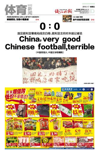 隔天的《钱江晚报》只有三个竞技体育版面,而有关国足的新闻被挤到了第3版,而且只有两句话。开篇用“0-0”作为标题,下面写道“国足叙利亚寒夜闷战交白卷,叙利亚主帅对本报记者说”——接下来的大字更雷人“China,very good Chinese football,terrible(中国很强大,中国足球很糟糕)”。文字下方是一张球迷的标语,标语的文字是:“国足,别赌了,你妈喊你回家吃饭。”