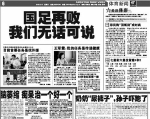 2008年6月15日,国足兵败天津无缘南非世界杯的次日,长春《新文化报》就以“国足再败,我们无话可说”这10个字来作为全部的新闻内容,而这也被球迷认为是“国内报纸对中国足球队的最经典评语”。的确,看着偌大版面只有10个字,球迷只能惊叹国足太不争气了,这可以说是平面媒体恶搞中国足球的先河。