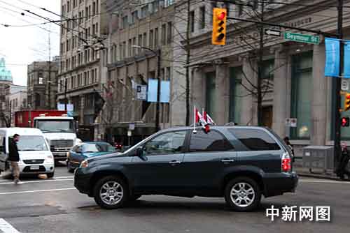 在温哥华街头,你可以看到不时驶过地插着加拿大国旗的轿车。赖海隆 摄