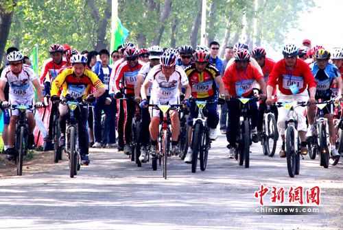 中新网高邮5月2日电(记者 崔佳明)5月2日,首届高邮湖国际业余自行车旅行赛在江苏省高邮开赛,参赛选手在休闲中追逐快乐,在竞赛中超越自我。