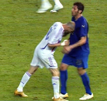2006年世界杯决赛,原本齐达内应该是比赛的英雄。当进行到加时赛第110分钟,在法国队的一次进攻中,齐达内突然转身猛地用自己的光头顶撞马特拉齐的胸口,意大利中卫应声倒地。随即齐达内被主裁判红牌罚下。这一惊人的事件让无数球迷目瞪口呆,事后齐祖证实马特拉齐用非常恶毒的语言问候了自己的母亲和姐姐。齐达内的“冲冠一怒”不仅给自己的职业生涯写下了一个不完美的句号,也断送了法国队的世界杯冠军梦想,至今还被人津津乐道。