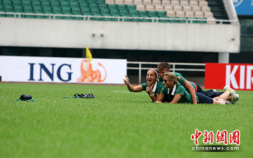 澳大利亚女足队员用自带的相机拍照留念。