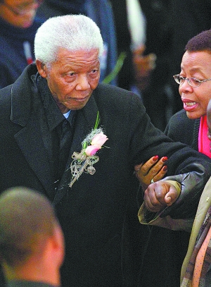 泽娜妮是在世界杯开幕前夜不幸遇难的,91岁高龄的曼德拉也因此取消了出席开幕式的计划。上午8时,悼念仪式在学校礼堂举行。热爱音乐的泽娜妮生前是该校唱诗班和乐队的成员,几乎每个人都喜欢这位性格开朗、活泼的小女孩。仪式以一首悼念歌曲开始,紧接着播放了一组幻灯片,由泽娜妮与曼德拉开心拥抱的合影组成。随后,几位亲属代表上前致悼词。老曼德拉也在亲人的陪伴下,步履蹒跚地来到仪式现场,他的衣襟上别着一小簇粉红色的花束,始终坐在前排,神情十分哀伤。