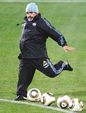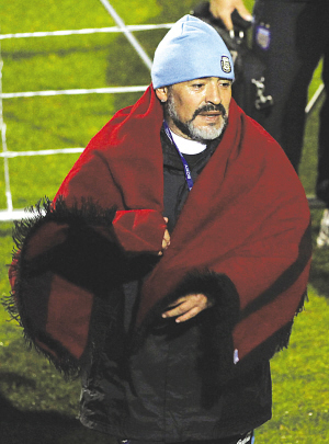当阿根廷队刚刚结束训练,马拉多纳一行正要返回更衣室,这时两个来自萨尔塔市(布宜诺斯艾利斯以北的小城)的阿根廷记者走了过来向老马讲述了他们长途跋涉带来礼物和祝福的故事,马拉多纳本来是快步走向更衣室的,听到记者的故事立刻停了下来。“这是来自San Antonio de Los Cobres,一个海拔4000米小城孩子们的礼物,他们托我们为你带来了毯子。”听到这里马拉多纳的真性情显露无遗,接过毯子立刻披在了身上。这个被提到的小城叫做 San Antonio de los Cobres,距萨尔塔市约180公里,距布宜诺斯艾利斯约1750公里,海拔高达4000米,那里的球迷无法通过电视来观看世界杯的比赛,但是他们一样喜欢马拉多纳,关注阿根廷队。许凯 黄启元 本报南非专电