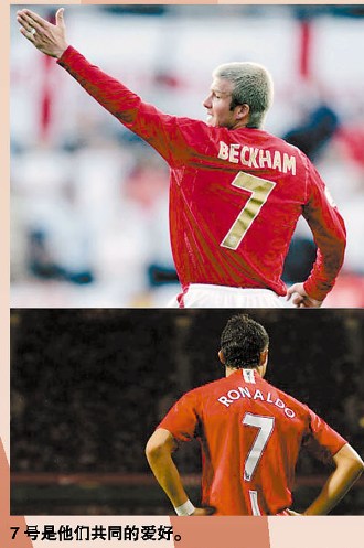 前几天,葡萄牙对阵朝鲜队时的大比分获胜,让大家记忆犹新。葡萄牙的7个进球,也有C罗的贡献。小贝、C罗曾效力的曼联,7号球衣始终属于最优秀的球员。继小贝之后,C罗穿上了向往已久的7号战袍。据说C罗住宅里拥有7字形的挂钟和按照7排列的饰品。小贝视7为幸运数由来已久,并将“7”文上了身。