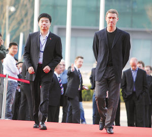照片:3月23日,斯诺克中国公开赛发布会前,丁俊晖(左)和亨德利一起出现在“水立方”北广场前的红地毯上。国新摄