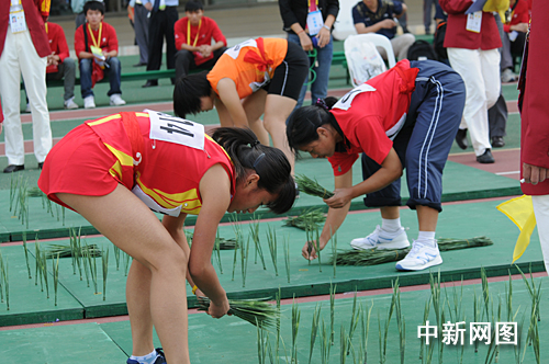 “刚开始感觉(插秧)很有趣,不过练起来可就没那么轻松了。”这是林贵婷谈到比赛时印象最深的一点。记者在现场看到,比赛在60米长的直跑道上进行,选手需先挑起箩筐,单手依次拾起20米处扎成捆的的塑料秧苗,然后在一块钻有300个小孔的绿色木板上进行比赛。