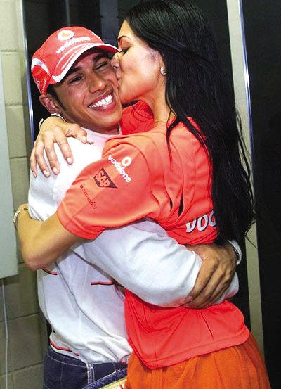 英国小伙子汉密尔顿夺冠后尽情与车队家人欢呼拥抱庆祝。他的歌星女友妮可更是欢欣雀跃,大摆风骚POSE助兴。走进后台,兴奋的妮可马上“熊抱”汉密尔顿,并深情激吻。