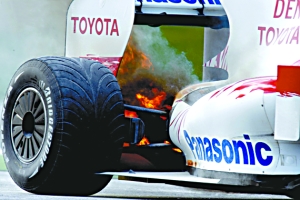 昨日,F1车队在阿尔加夫赛道举行的首轮季前测试进入第三日。图为德国车手格洛克驾驶的丰田TF109赛车在测试中车尾着火,事故原因不详。