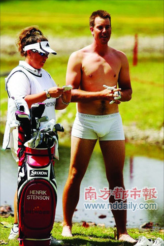 日前,高尔夫WGC-CA锦标赛首轮,瑞典高尔夫名将亨利克·斯滕森脱光衣服救球的“壮举”无疑是赛场上最吸引眼球的风景。当日在第3洞4杆洞,斯滕森直接将球开进了球道旁的淤泥中,瑞典人一不做二不休,索性脱掉衣服鞋袜,仅剩一条内裤径直走进泥里,引起场边观众一阵骚动,斯滕森不负众望,这一洞一举吞下一个柏忌,最终以69杆排名第17位。