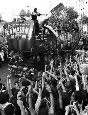 大巴缓缓行驶了3个多小时,才抵达诺坎普球场,球场内98000名球迷足足坐等了一个多小时。狂欢晚会比预定时间晚了1个多小时才开始,当巴萨球员手捧三座奖杯进场时,球迷们山呼海啸,伴随着震耳欲聋的音乐、五彩缤纷的礼花,现场气氛达到了最高潮。记者 黄永顺
