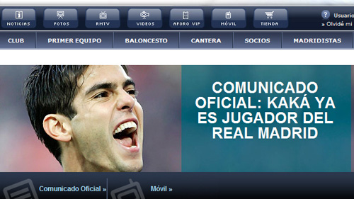 皇马官网声明称,卡卡已成功通过所有体检,与皇马签下一份为期六年的合同。根据媒体披露,卡卡的转会费达6500万欧元,年薪900万欧元。稍后,AC米兰官网也确认了这一消息。