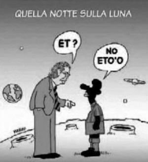 漫画的标题是“Quella Notte Sulla Luna(月球上的那一晚)”,借着“人类登月40周年”的名头来调侃一下意甲的转会。月球的环形山之间,站着两个卡通人物,左边身穿蓝色西装的老头,是国际米兰主席莫拉蒂,右边身穿红蓝色巴萨球衣的黑人,是喀麦隆前锋埃托奥。