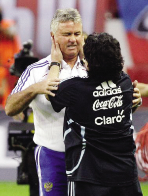阿根廷昨天做客挑战俄罗斯,所有的焦点都在两队主教练马拉多纳和希丁克身上,可惜荷兰人再神奇也抵不上球王有一个神奇的女婿——凭借阿奎罗的两传一射,缺少梅西的阿根廷3比2逆转战胜了俄罗斯,为9月5日与巴西队的世界杯预选赛找回了宝贵的信心。
