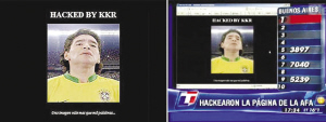 这名自称“KKR”的黑客篡改了阿根廷足协官方网站的内容,将原有的网站内容删去,并将一张马拉多纳身穿巴西国家队队服的广告截图照片放在首页上(点击观看广告)。在“巴西版马拉多纳”的图片上方,黑客嚣张地留下了自己的名字——“HACKED BY KKR”,而在图片下方,这名黑客用西班牙文写了一段话“Una imagen vale más que mil palabras”,意为“一张照片胜过千言万语”。