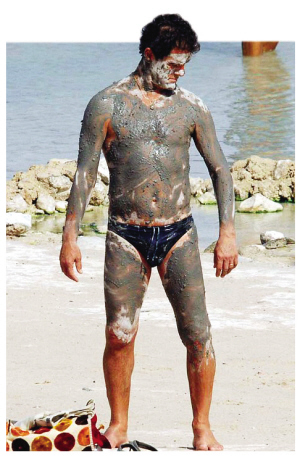 意大利南部小城大多有水温从32到37摄氏度不等的温泉,这些景点专门提供一些泥浴治疗服务。来这里享受休闲的卡佩罗及其妻子就这样一不小心落入了记者的镜头。与比赛场边的威严姿态大相径庭,镜头前只穿了一条黑色泳裤的卡佩罗从头到脚、甚至包括脸部都涂满了深灰色的泥浆,要不是那一头标志性的卷发,意大利人的身份还真有些难以“识别”。身边的劳拉更将泥浆涂抹得辨别不出了比基尼的花色。低头看看自己身上的“作品”还算令人满意,63岁的卡佩罗于是走到劳拉身边,和自己的老婆开起了玩笑。