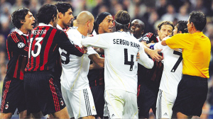 尽管皇马2:3主场不敌AC米兰,赛前成为焦点的米兰旧将卡卡也表现不佳,但皇马队长劳尔的表现却可圈可点:助攻队友德伦特攻入一球,而且在比赛中还破门首开纪录,凭借此球劳尔的个人欧冠进球数为66球,占据欧冠历史个人射手榜榜首。然而,就是这位球技、职业素养、人品都还不错的32岁老将,却成为两队此战爆发肢体冲突的主角。
