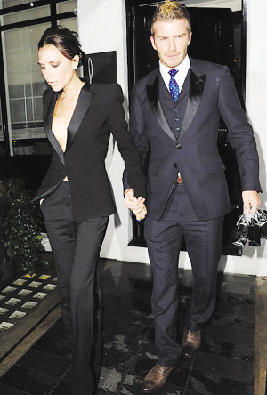 没有毛衫、没有外套,这次和老公外出浪漫烛光晚餐,维多利亚穿的是一件超低深V领黑色西装、并且真空出境,胸前肋骨根根分明。想必在圣诞这样喜庆的日子里,将骨感追求到底的贝嫂也一如既往地拒绝了一切美食甜点的诱惑。要风度不要温度的维多利亚更恪守“只露一点点”的性感心经,仅系一粒纽扣巧妙地让前胸和小腹的春光若隐若现。相形之下,老公贝克汉姆倒是西装马甲里外三件套裹了个严严实实,为了突出情侣装的效果,维多利亚更将自己的指甲涂成了银蓝色,与爱人脖子上的领带遥相呼应。