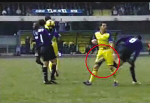 在本轮结束的国米与切沃的比赛中,卢西奥使出了一招“蝎子摆尾”,但是目标却是对手的裆部。