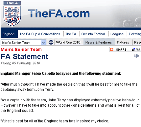 英格兰主帅卡佩罗在英足总官网上的声明中表示:“经过深思熟虑后,我决定撤销约翰·特里的队长职务。作为国家队队长,约翰·特里在场上的表现无可挑剔,但我要做出的决定更多的是为了整个英格兰队考虑。”