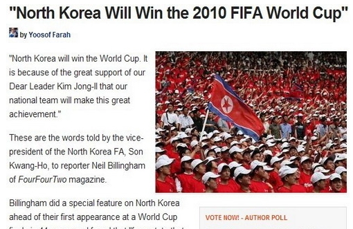 在此前的热身赛中球队2-2战平前欧洲冠军希腊,这场平局极大刺激了朝鲜人的信心。在谈到为何认为球队能够夺冠时,孙光浩态度十分坚定:“本届世界杯朝鲜将会夺冠,因为我们有亲爱的领袖金正日的巨大支持。这将会带领我们达到最后的目标!”
