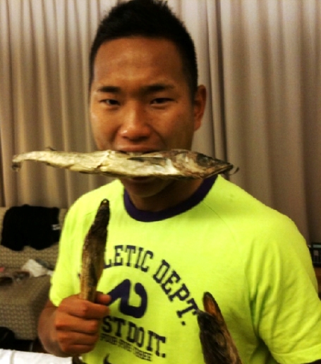 中新网6月19日电 在和巴西队的比赛中表现出色的朝鲜国家队队员郑大世在博客中上传了“明太鱼照片”,引起了人们的热议。韩国《中央日报》报道称,他在博客中公开了自己咬着明太鱼的滑稽照片。他说:“明太鱼是朝鲜国家队队员们喜欢的零食,我也很喜欢。”